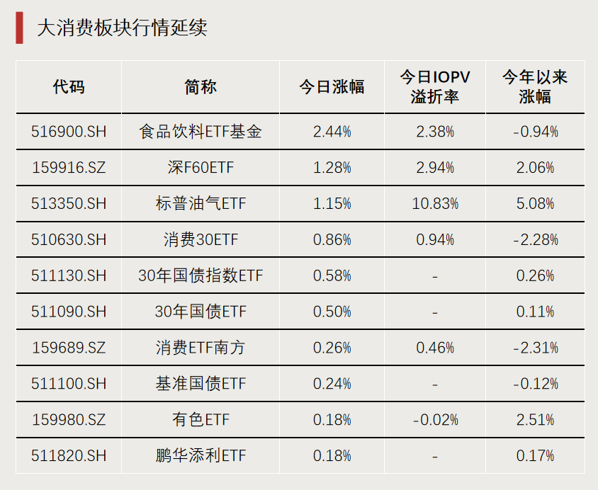 食品饮料等大消费板块延续昨日行情,并且食品饮料也是今日唯一收涨的申万一级行业,食品饮料ETF基金(516900)涨超2%,位居ETF涨幅榜首,消费30ETF(510630)、消费ETF南方(159689)等小幅上涨。