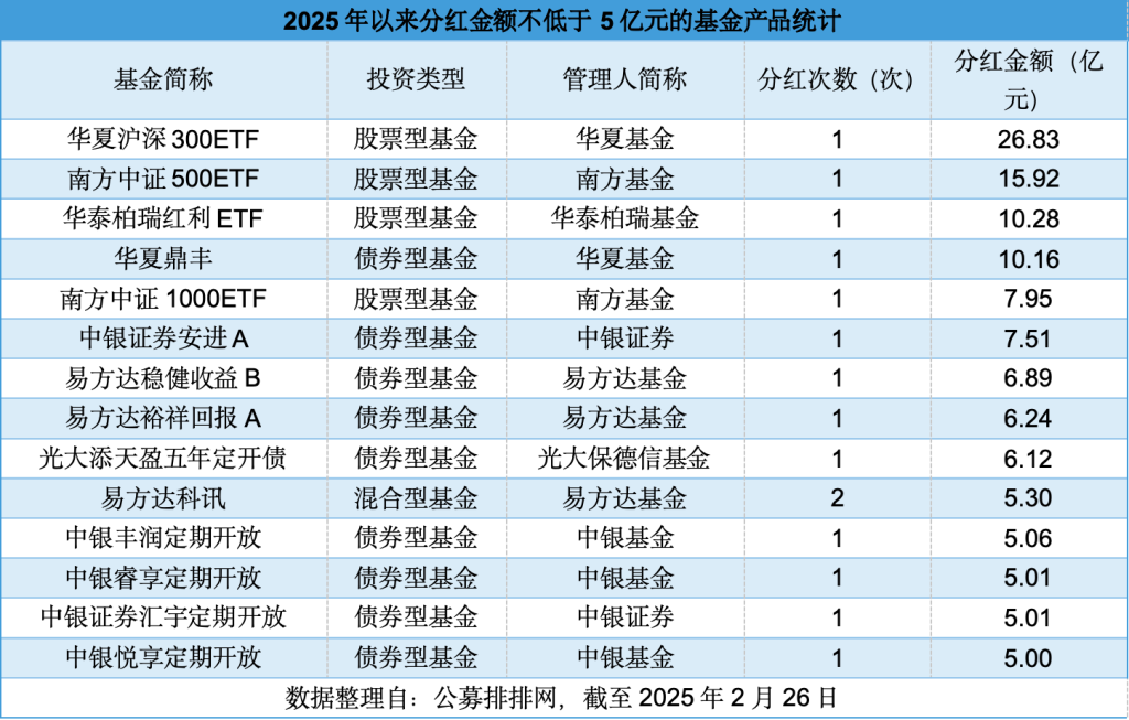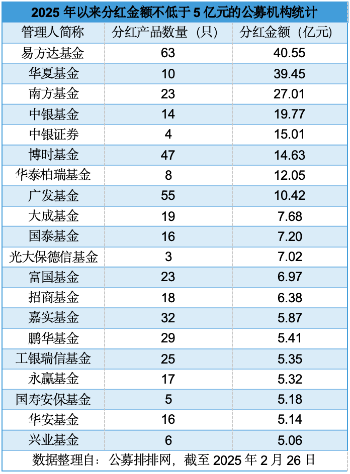此外,中银基金、中银证券、博时基金、华泰柏瑞基金和广发基金2025年以来分红金额也均不低于10亿元。