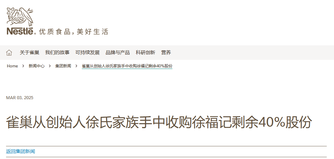 【大河财立方消息】3月3日,雀巢官网显示,雀巢已与徐氏家族达成协议,收购徐福记剩余40%的股份。
