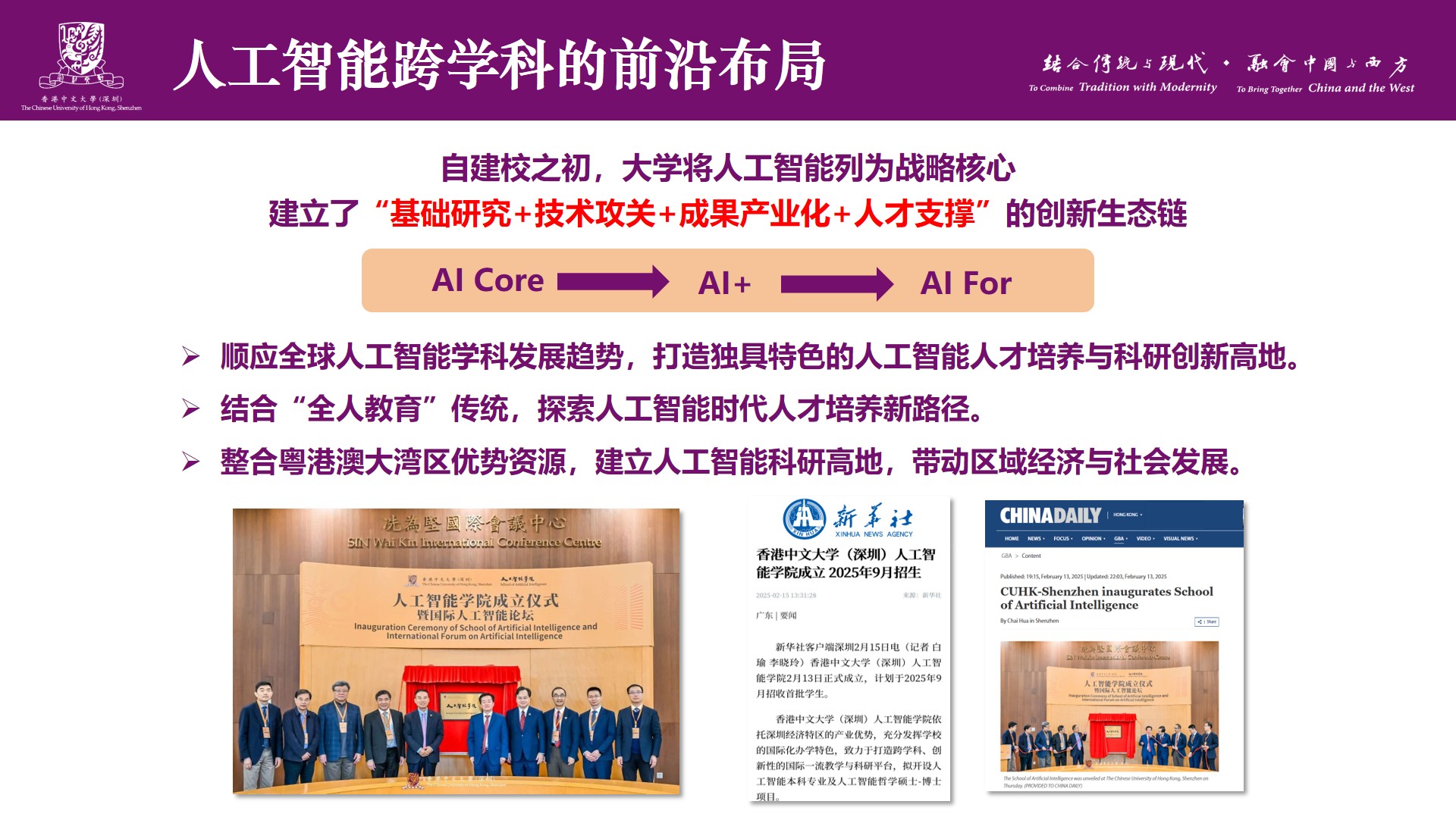 作为港中大(深圳)的校长,徐校长还分享了学校在人工智能教育与人才培养方面的创新实践。自建校之初,大学便将人工智能列为战略核心,建立了“基础研究+技术攻关+成果产业化+人才支撑”(AI Core→AI +→AI For)的创新生态链。在2025年2月13日,港中大(深圳)成立了一所新学院——人工智能学院,顺应全球人工智能学科发展趋势,打造独具特色的人工智能人才培养与科研创新高地。