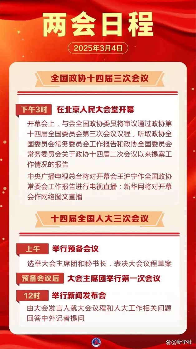全国政协十四届三次会议3月4日下午3时开幕。十四届全国人大三次会议举行预备会议。