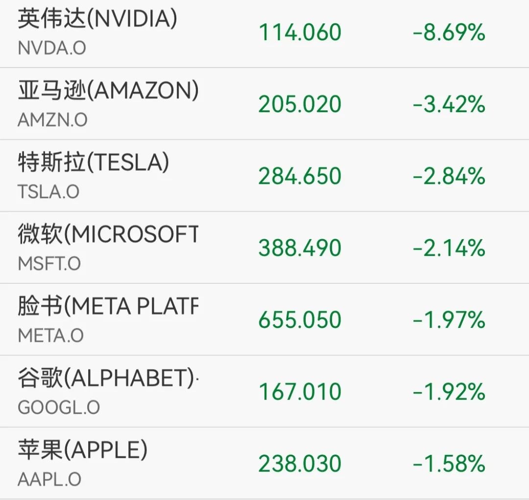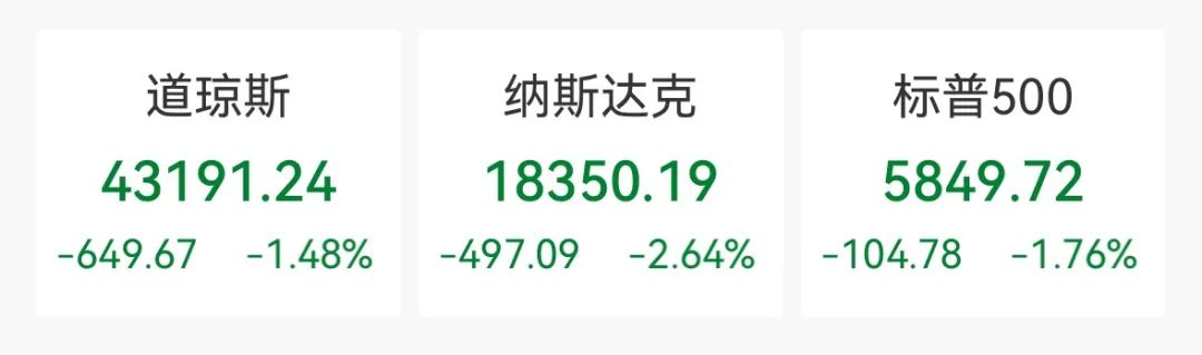 截至收盘,道指跌649.67点,跌幅为1.48%,报43191.24点;纳指跌497.09点,跌幅为2.64%,报18350.19点;标普500指数跌104.78点,跌幅为1.76%,报5849.72点。
