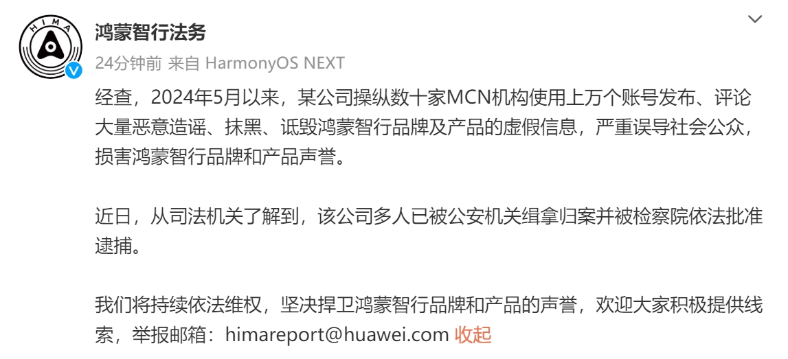 每经AI快讯,3月4日,鸿蒙智行法务微博发文称,经查,2024年5月以来,某公司操纵数十家MCN机构使用上万个账号发布、评论大量恶意造谣、抹黑、诋毁鸿蒙智行品牌及产品的虚假信息,严重误导社会公众,损害鸿蒙智行品牌和产品声誉。近日,从司法机关了解到,该公司多人已被公安机关缉拿归案并被检察院依法批准逮捕。