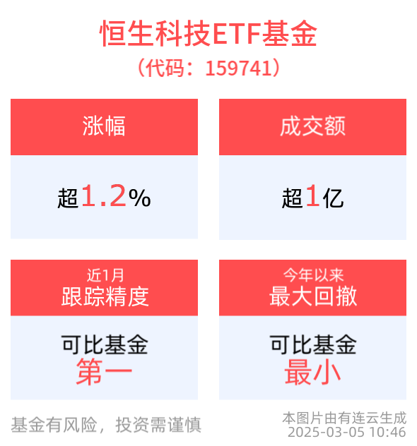 截至2025年3月5日 10:46,恒生科技指数强势上涨1.15%,成分股同程旅行上涨7.04%,华虹半导体上涨3.11%,美团-W上涨2.92%,中芯国际、小米集团-W等个股跟涨。恒生科技ETF基金(159741)上涨1.20%,盘中成交额已达1.74亿元,换手率29.53%,市场交投活跃。