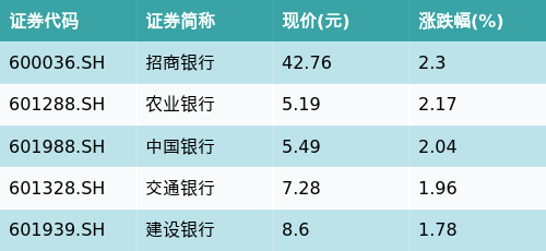 截至早盘收盘,跨境支付(CIPS)主题涨跌幅最高的五只股票为:招商银行(600036.SH)、农业银行(601288.SH)、中国银行(601988.SH)、交通银行(601328.SH)与建设银行(601939.SH)。详情见下表: