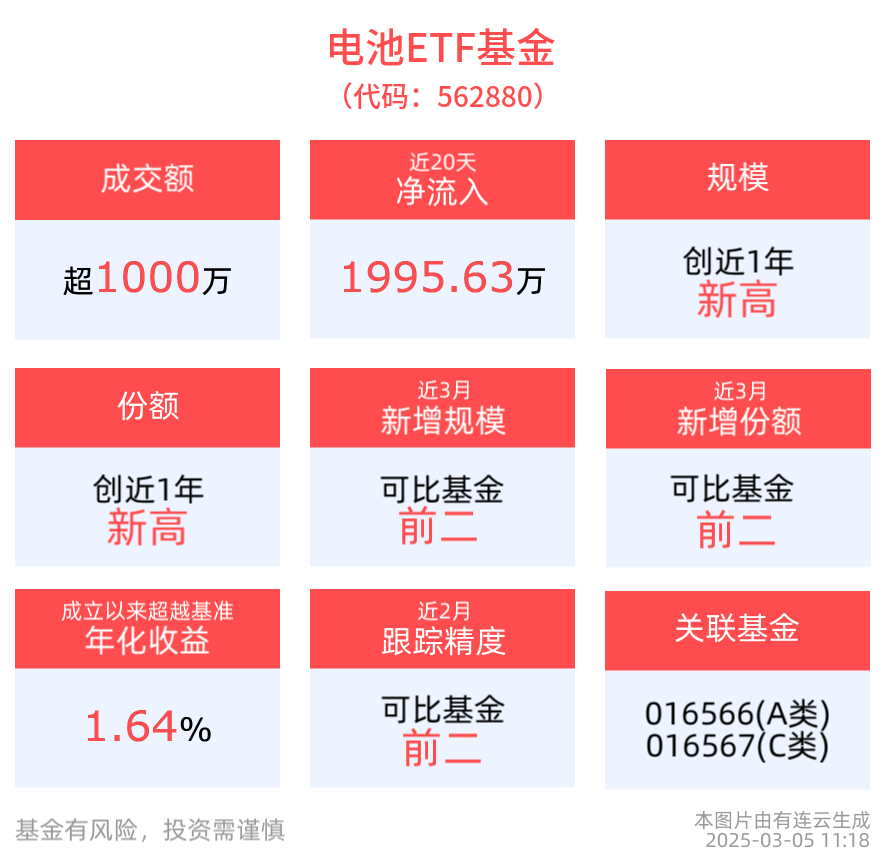 规模方面,电池ETF基金最新规模达3.61亿元,创近1年新高。份额方面,电池ETF基金最新份额达6.63亿份,创近1年新高。