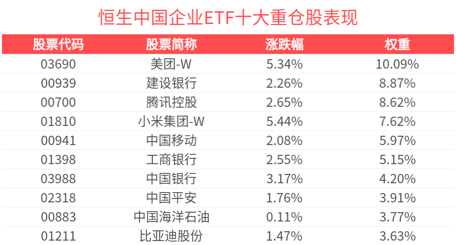 数据显示,截至2025年3月4日,恒生中国企业指数(HSCE)前十大权重股分别为阿里巴巴-W(09988)、小米集团-W(01810)、腾讯控股(00700)、建设银行(00939)、美团-W(03690)、中国移动(00941)、工商银行(01398)、比亚迪股份(01211)、中国银行(03988)、中国平安(02318),前十大权重股合计占比61.91%。