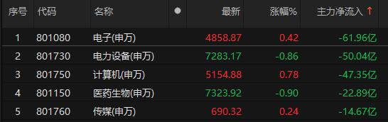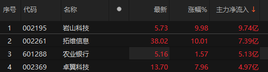 上证报中国证券网讯截至3月5日14时26分,申万一级行业板块中,主力资金净流入银行、通信、汽车等板块,净流出电子、电力设备、计算机等板块,其中电子板块净流出超60亿元。个股方面,岩山科技涨停,主力资金净流入9.74亿元,位居首位。拓维信息、农业银行等获主力资金净流入额居前。全志科技跌近1%,主力资金净流出超6亿元,位居首位。城地香江、宁德时代等主力资金净流出额居前。