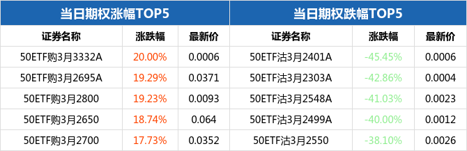 50ETF期权当日有166个合约正在交易。从涨跌幅来看,50ETF期权合约中,50ETF购3月3332A涨幅最大,为20.00%,报收0.0006元;50ETF沽3月2401A跌幅最大,为45.45%,报收0.0006元。