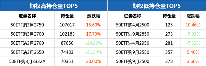 从持仓量来看,50ETF期权合约中,50ETF购3月2750持仓量最大,为107017张,期权全日上涨15.69%,报收0.0177元;持仓量最小的为50ETF购4月2500,共计125张,期权全日上涨10.46%,报收0.2102元。