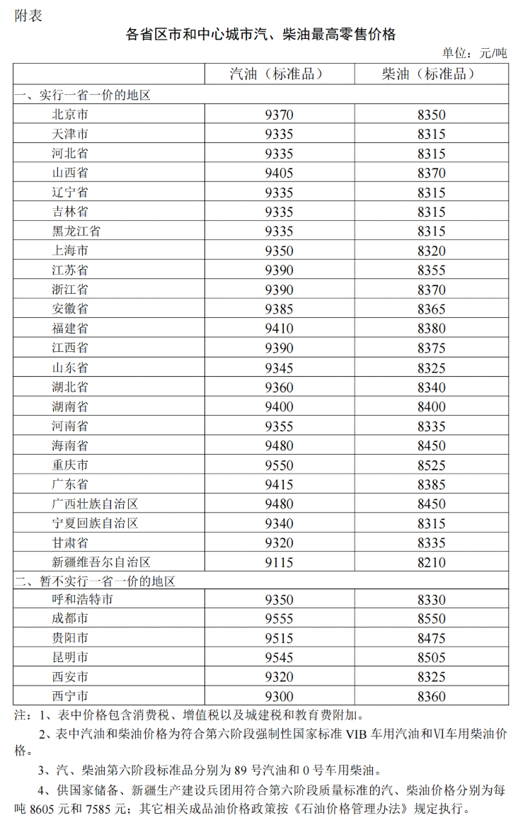 根据近期国际市场油价变化情况,按照现行成品油价格形成机制,自2025年3月5日24时起,国内汽、柴油价格(标准品,下同)每吨分别降低135元和130元。调整后,各省(区、市)和中心城市汽、柴油最高零售价格见附表。