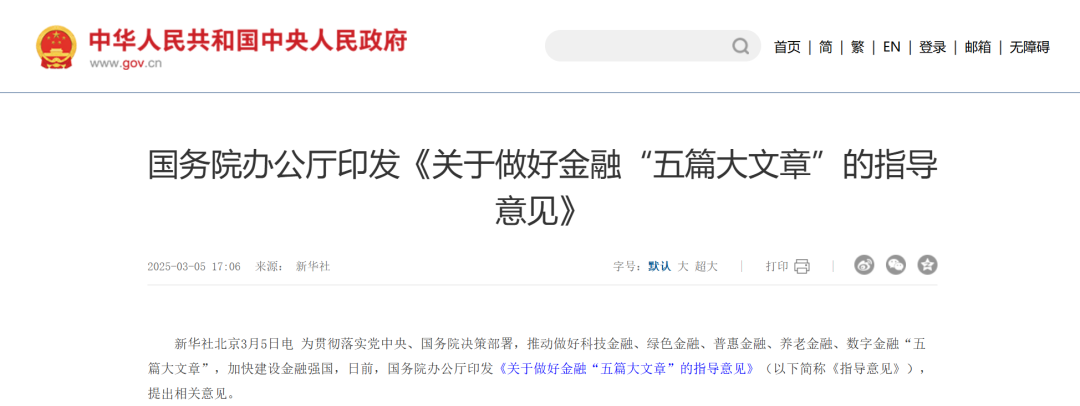 为贯彻落实党中央、国务院决策部署,推动做好科技金融、绿色金融、普惠金融、养老金融、数字金融“五篇大文章”,加快建设金融强国,经国务院同意,现提出以下意见。