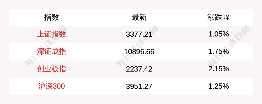 每经AI快讯:北京时间3月6日11:30,上证指数早盘上涨35.25点,涨幅为1.05%,报收3377.21点,成交额4495.92亿元;深证成指上涨187.2点,涨幅为1.75%,报收10896.66点,成交额7160.97亿元;创业板指上涨47.06点,涨幅为2.15%,报收2237.42点,成交额3559.88亿元;沪深300上涨48.7点,涨幅为1.25%,报收3951.27点,成交额2382.9亿元。
