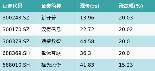 截至早盘收盘,华为概念主题涨跌幅最高的五只股票为:新开普(300248.SZ)、汉得信息(300170.SZ)、鼎捷数智(300378.SZ)、致远互联(688369.SH)与福光股份(688010.SH)。详情见下表: