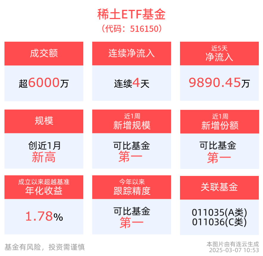 规模方面,稀土ETF基金最新规模达17.86亿元,创近1月新高。份额方面,稀土ETF基金近1周份额增长8900.00万份,实现显著增长。
