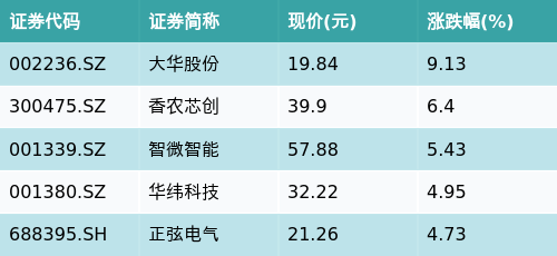 截至早盘收盘,机器人概念主题涨跌幅最高的五只股票为:大华股份(002236.SZ)、香农芯创(300475.SZ)、智微智能(001339.SZ)、华纬科技(001380.SZ)与正弦电气(688395.SH)。详情见下表: