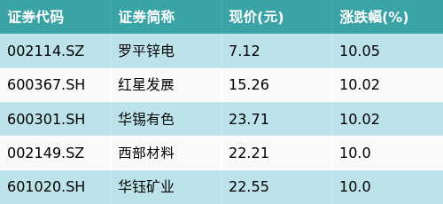 截至早盘收盘,小金属概念主题涨跌幅最高的五只股票为:罗平锌电(002114.SZ)、红星发展(600367.SH)、华锡有色(600301.SH)、西部材料(002149.SZ)与华钰矿业(601020.SH)。详情见下表: