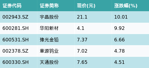 截至早盘收盘,稀土永磁主题涨跌幅最高的五只股票为:宇晶股份(002943.SZ)、华阳新材(600281.SH)、豫光金铅(600531.SH)、章源钨业(002378.SZ)与天通股份(600330.SH)。详情见下表: