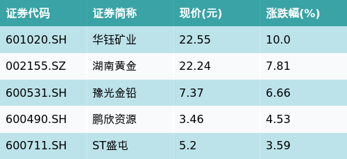 截至早盘收盘,黄金概念主题涨跌幅最高的五只股票为:华钰矿业(601020.SH)、湖南黄金(002155.SZ)、豫光金铅(600531.SH)、鹏欣资源(600490.SH)与ST盛屯(600711.SH)。详情见下表: