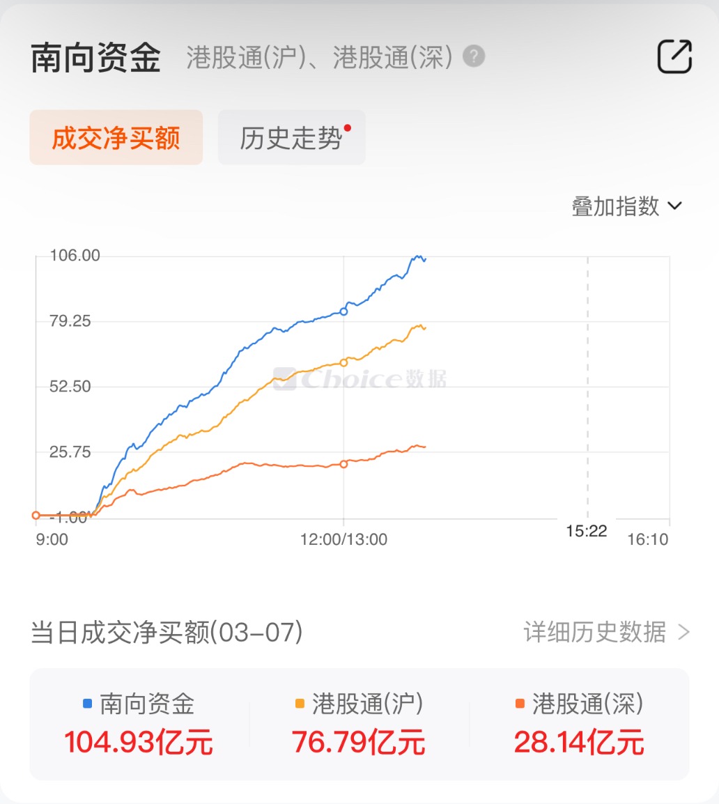 上证报中国证券网讯 3月7日13时49分,南向资金净买入超100亿港元,达到104.93亿港元。