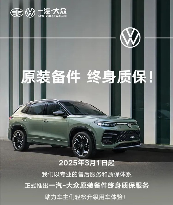 一汽大众近日宣布,自3月1日起正式推出原装备件终身质保服务。其微信公众号发文称:“在未来的用车生活中,当您的爱车备件发生质量问题而需要维修或更换时,一汽大众原装备件终身质保将随时为您承担服务范围内的全部维修费用。”