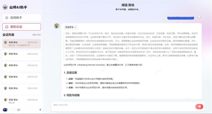 同样,山东师范大学教育学部硕士研究生杜楠楠也第一时间尝试使用了智能服务平台。她说,学校的DeepSeek对自己进行学术研究和日常学习带来了很多便利。“山师的DeepSeek不仅具备DeepSeek原有功能,还进行了一些提升,问同样的问题,山师的DeepSeek回答比原来的DeepSeek更加全面、细致,它不仅能回答提出的问题,还能给出参考文献的锚点和调整建议,对于自己的学术研究更具有启发和引导作用。”