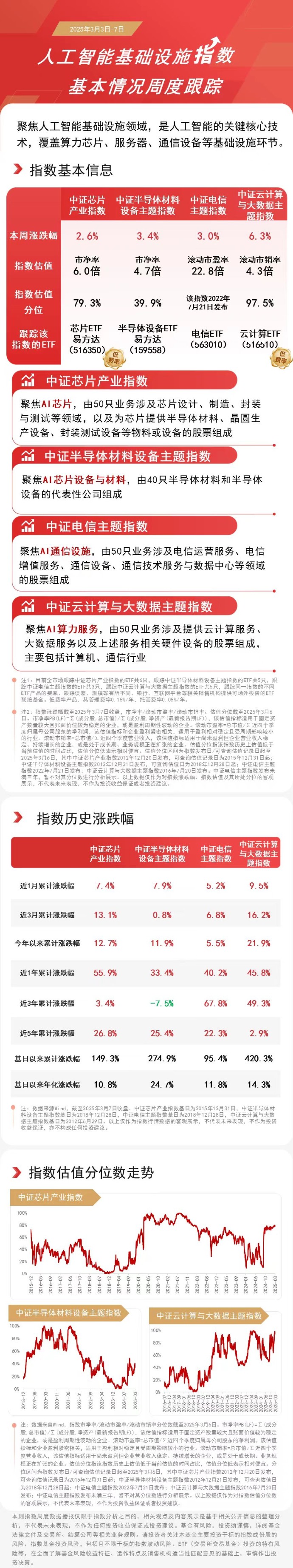 本周,中证云计算与大数据主题指数上涨6.3%,中证半导体材料设备主题指数上涨3.4%,中证电信主题指数上涨3%,中证芯片产业指数上涨2.6%。