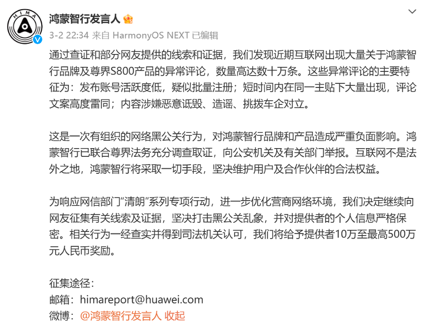 一、悬赏500万元,鸿蒙智行向网络谣言说“不”