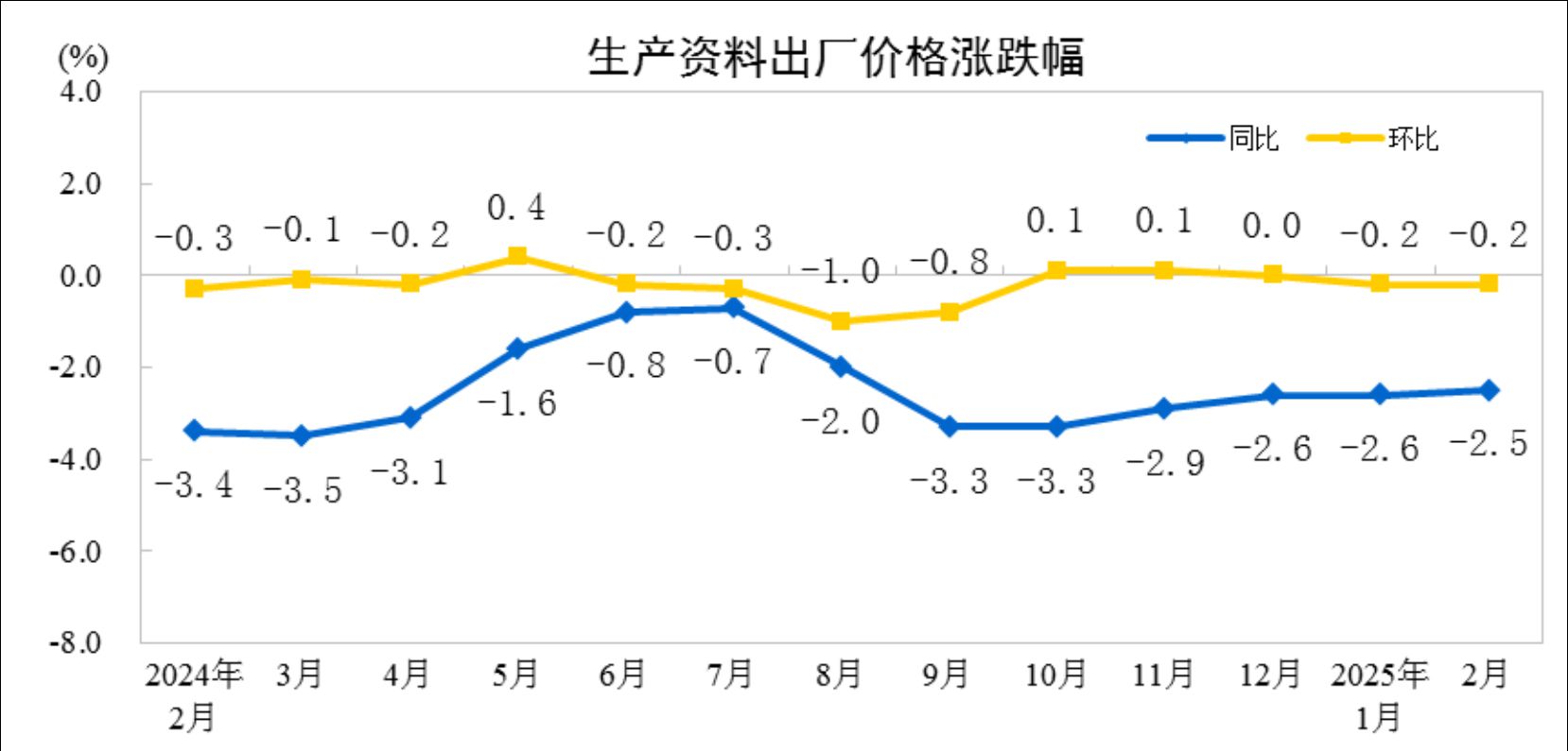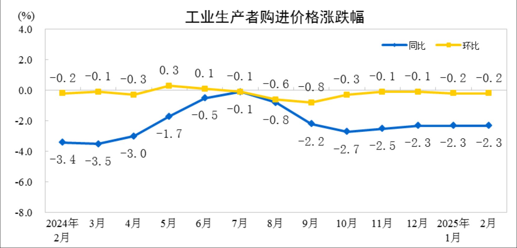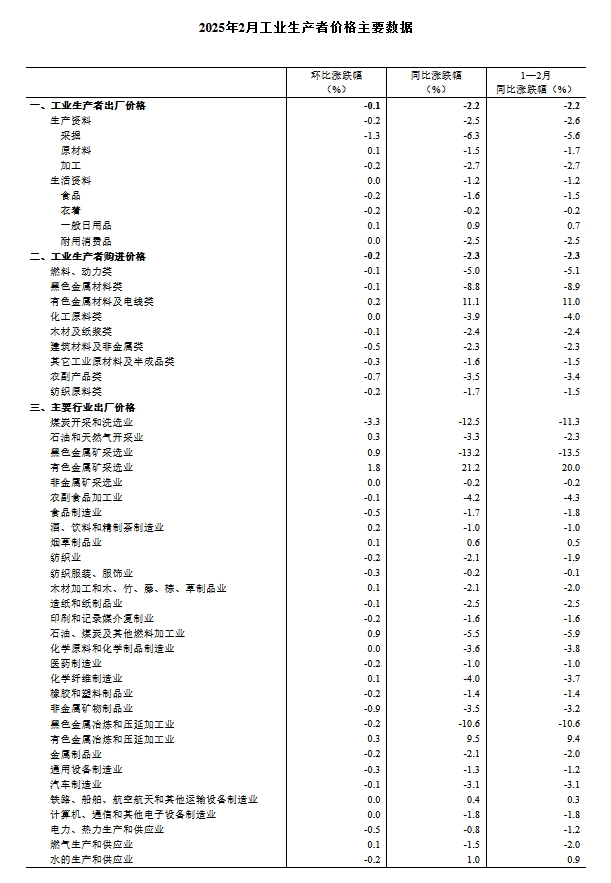中新网3月9日电据国家统计局网站消息,2025年2月份,全国工业生产者出厂价格同比下降2.2%,环比下降0.1%,降幅比上月均收窄0.1个百分点;工业生产者购进价格同比下降2.3%,环比下降0.2%。1—2月平均,工业生产者出厂价格比上年同期下降2.2%,工业生产者购进价格下降2.3%。