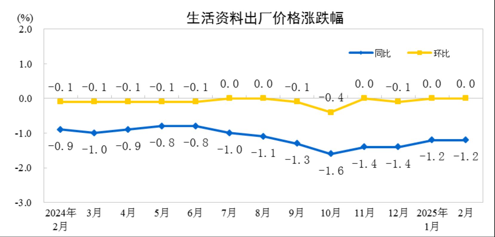 2月份,工业生产者出厂价格中,生产资料价格下降0.2%,影响工业生产者出厂价格总水平下降约0.14个百分点。其中,采掘工业价格下降1.3%,原材料工业价格上涨0.1%,加工工业价格下降0.2%。生活资料价格持平。其中,食品价格下降0.2%,衣着价格下降0.2%,一般日用品价格上涨0.1%,耐用消费品价格持平。