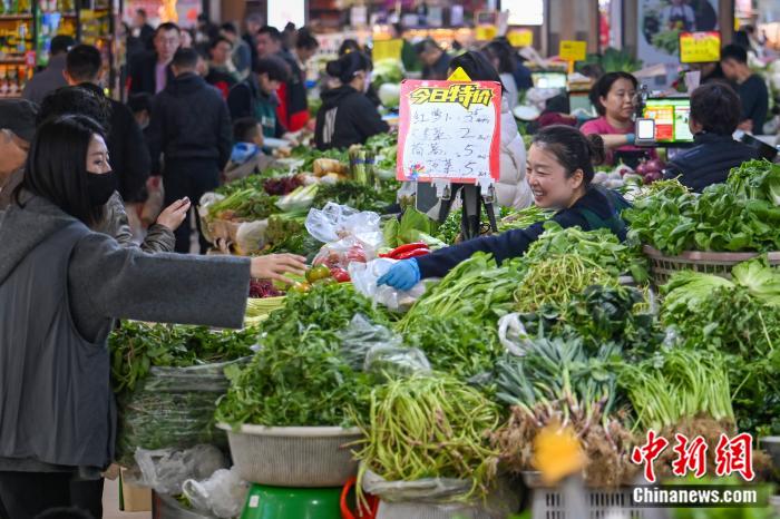3月9日,市民在江苏南京太平农贸市场购买蔬菜。中国国家统计局当日公布,2月份CPI同比下降0.7%、环比下降0.2%。国家统计局城市司首席统计师董莉娟表示,CPI同比由涨转降,原因之一是春节错月导致上年同期对比基数较高。上年2月份受春节因素影响,食品和服务价格上涨较多,抬高了今年2月份的对比基数,导致今年2月份同比受上年价格变动的影响为负。 中新社记者泱波摄