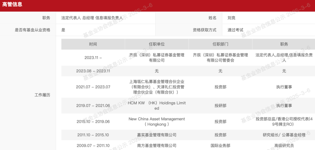 3月3日,中国证券投资基金业协会(以下简称协会)发布了新一批完成备案登记的私募基金管理人名单,涉及2家私募机构。其中,齐辰(深圳)私募证券基金管理有限公司(以下简称齐辰私募基金)的法人、总经理刘竞拥有15年左右的金融从业经验,曾先后在南方基金、嘉实基金、瓴仁私募任职。