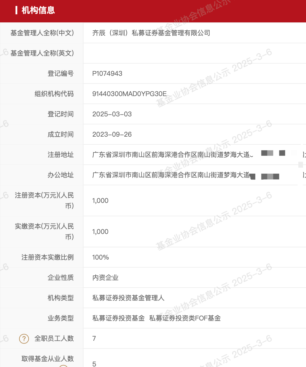 【导读】齐辰私募基金完成备案登记,创始人曾任职大型公募、百亿元私募