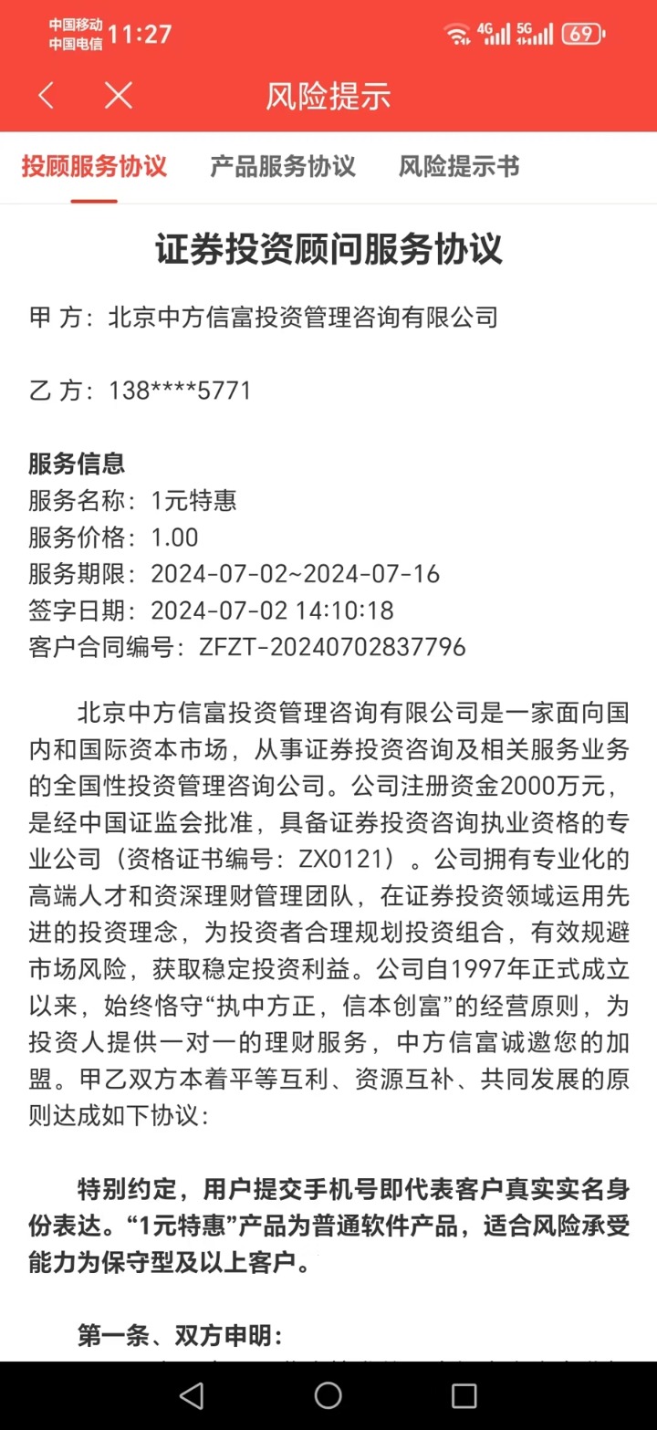 连续几天,田玲都给章女士发去所推荐股票的涨幅,称只要跟着导师的指导买就能赚大钱,且可以先购买半个月的投资顾问服务试一试。7月2日,章女士终于被说服。半个月的荐股服务要价一万元,但章女士称,当时双方通过网络签订了一份“阴阳合同”。她提供的合同上,约定费用仅有1元,提供服务的为“北京中方信富投资管理咨询有限公司”,而实际的一万元则另行通过微信转账支付。对于这不寻常的操作,投资心切的章女士当时并未起疑。