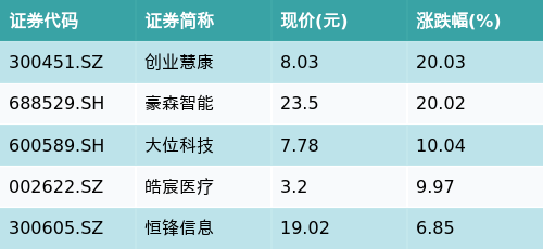 截至收盘,国产软件主题涨跌幅最高的五只股票为:创业慧康(300451.SZ)、豪森智能(688529.SH)、大位科技(600589.SH)、皓宸医疗(002622.SZ)与恒锋信息(300605.SZ)。详情见下表: