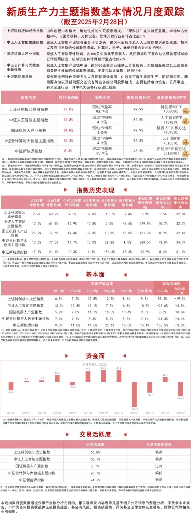 2月,算力、机器人、AI智能体等概念集体拉升,指数方面,中证云计算与大数据主题指数上涨16.3%,国证机器人产业指数上涨14.8%,上证科创板50成份指数上涨13.0%,中证人工智能主题指数上涨11.8%,中证新能源指数上涨5.4%。