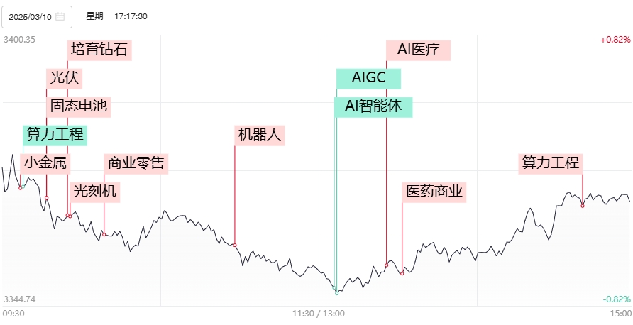 财联社3月11日电,市场全天震荡调整,三大指数小幅下跌。个股涨多跌少,全市场超3200只个股上涨。沪深两市全天成交额1.51万亿,较上周五缩量3126亿。1)上周末,华为正式宣布组建医疗卫生军团,将重点构建AI辅助诊断解决方案体系。AI医疗概念全天逆势活跃,但润达医疗、塞力医疗等领涨品种多为此前滞涨的低位品种,而贝瑞基因、卫宁健康等此前领涨品种悉数走出高开低走行情。2)近期机器人产业链再度迎来多重催化,“稚晖君”智元机器人发布首个通用具身基座大模型 GO-1,此外华为沈阳与国家机器人创新中心交流具身智能公共服务平台等合作。机器人概念分化态势加剧,智元机器人等低位分支表现偏强并扩散至神经网络等分支,方正电机、威孚高科、豪森智能等涨停,斯菱股份、丰立智能等此前创出历史或阶段新高个股纷纷位居跌幅前列。3)据InfoLink 统计,3月电池片排产57-58GW,环比+22%;开工率64%,环比+12pct。因此辅材、逆变器等前端受益方向仍领涨整个光伏产业链。此外除去近期热度仍处相对高位的固态电池外,此前表现不温不火的复合集流体概念出现东威科技等多股涨停。但目前整个新能源产业链的修复仍聚焦于几大基本面逻辑较硬的细分方向,目前成交量能和人气地位仍不足以支撑其走出普反修复。4)数据显示,3月10日,生意社锑基准价为161500.00元/吨,与本月初(150000.00元/吨)相比,上涨了7.67%。此外受到刚果(金)暂停出口刺激,生意社钴基准价相比月初上涨超15%。多个小金属价格的持续上涨继续刺激相关概念股活跃,洛阳钼业、华友钴业、华钰矿业等核心品种悉数大涨。