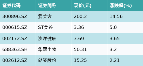 截至早盘收盘,医美概念主题涨跌幅最高的五只股票为:爱美客(300896.SZ)、ST美谷(000615.SZ)、澳洋健康(002172.SZ)、华熙生物(688363.SH)与朗姿股份(002612.SZ)。详情见下表: