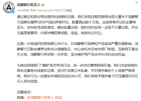 此前,3月2日,鸿蒙智行发言人在社交媒体平台发文称,最高悬赏500万元打击黑公关。