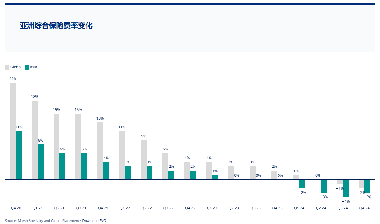 根据全球保险经纪与风险咨询巨头达信(Marsh)近日发布的全球保险市场指数(下称“指数”),2024年第四季度,全球商业保险费率同比下降了2%,这是7年来连续第二次下降。而亚洲地区商业险综合费率更是在去年四个季度均呈现同比下降态势,其中第四季度下降了3%。