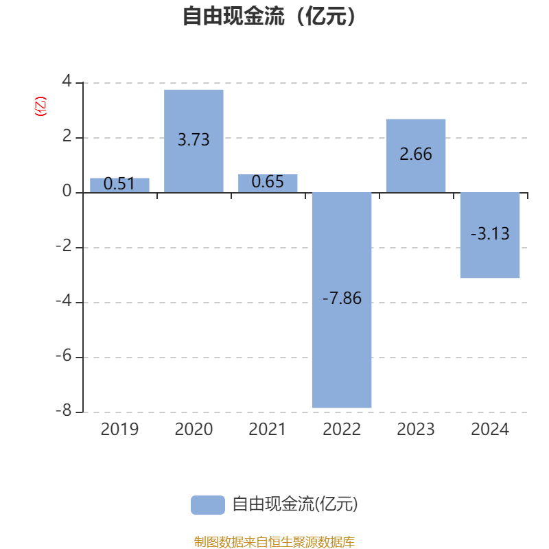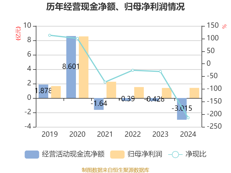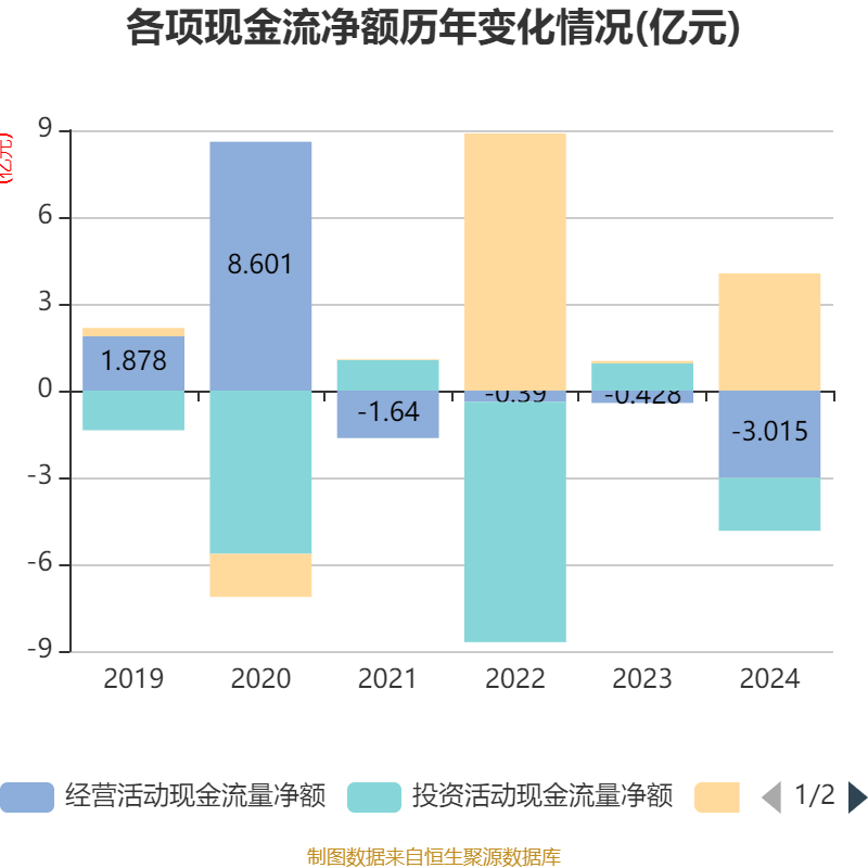 截至2024年,公司经营活动现金流净额为-3.01亿元,同比减少2.59亿元;筹资活动现金流净额4.05亿元,同比增加3.97亿元;投资活动现金流净额-1.83亿元,上年同期为9393.31万元。