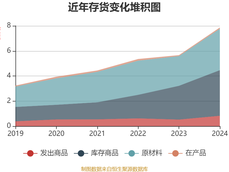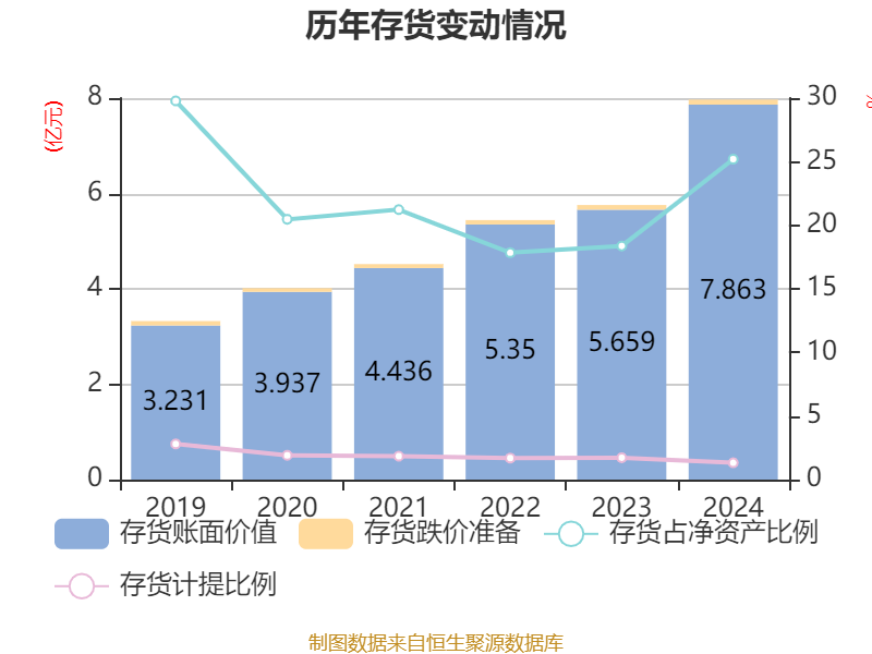 从存货变动来看,截至2024年末,公司存货账面价值为7.86亿元,占净资产的25.2%,较上年末增加2.2亿元。其中,存货跌价准备为1049.03万元,计提比例为1.32%。