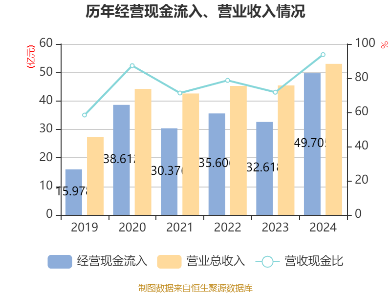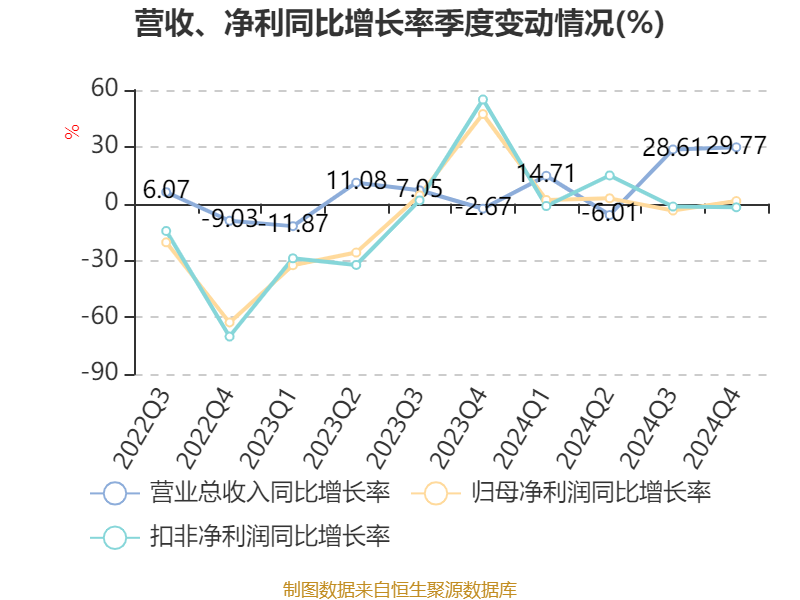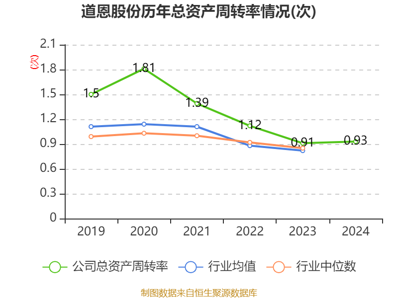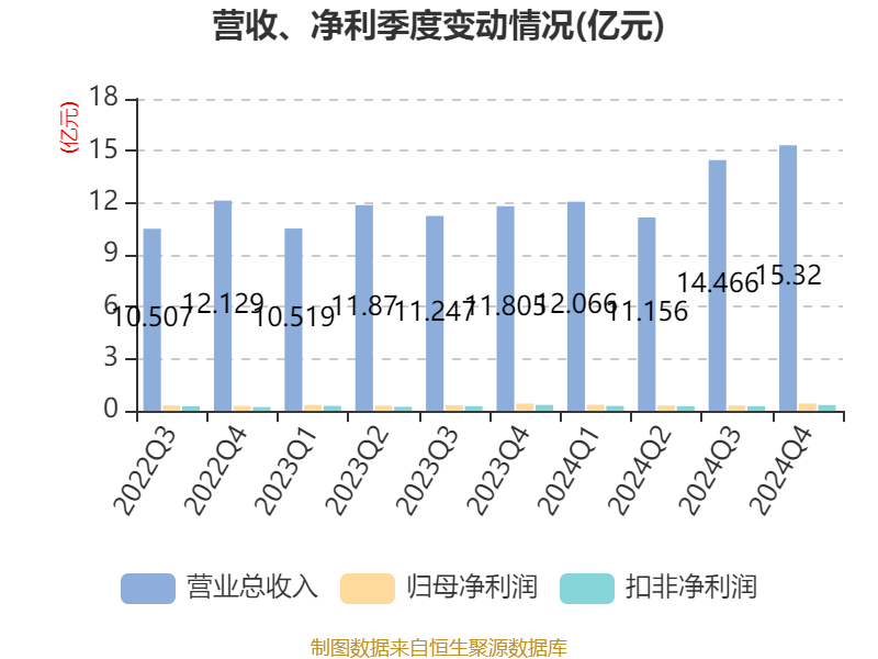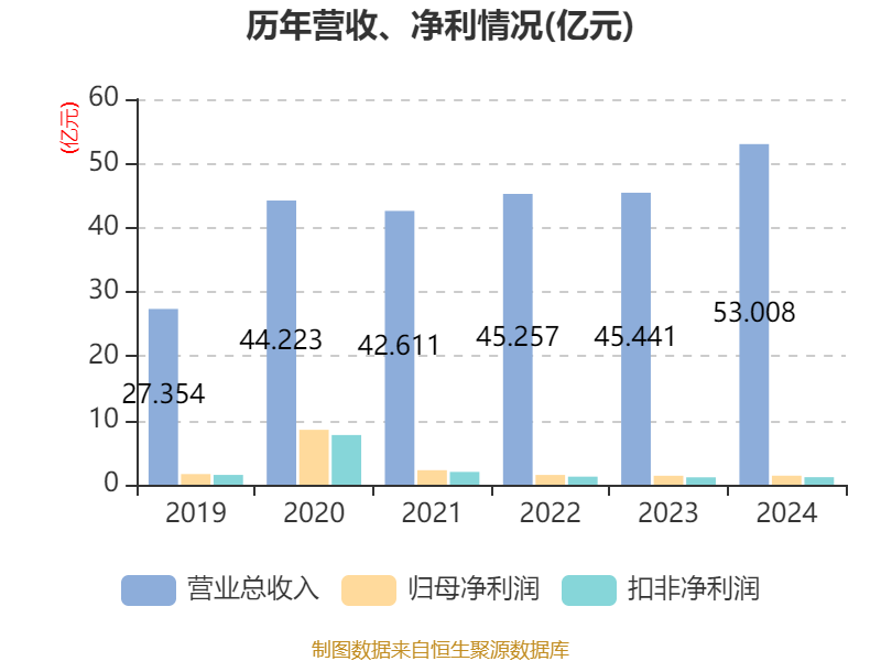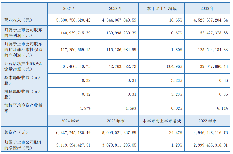 中证智能财讯道恩股份(002838)3月12日披露2024年年度报告。2024年,公司实现营业总收入53.01亿元,同比增长16.65%;归母净利润1.41亿元,同比增长0.67%;扣非净利润1.17亿元,同比增长1.80%;经营活动产生的现金流量净额为-3.01亿元,上年同期为-4276.33万元;报告期内,道恩股份基本每股收益为0.32元,加权平均净资产收益率为4.57%。公司2024年度分配预案为:拟向全体股东每10股派现0.65元(含税)。