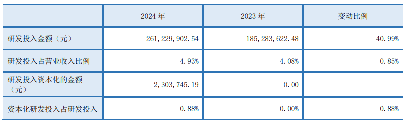 2024年全年,公司研发投入金额为2.61亿元,同比增长40.99%;研发投入占营业收入比例为4.93%,相比上年同期上升0.85个百分点。此外,公司全年研发投入资本化率为0.88%。