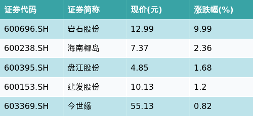 截至早盘收盘,白酒概念主题涨跌幅最高的五只股票为:岩石股份(600696.SH)、海南椰岛(600238.SH)、盘江股份(600395.SH)、建发股份(600153.SH)与今世缘(603369.SH)。详情见下表: