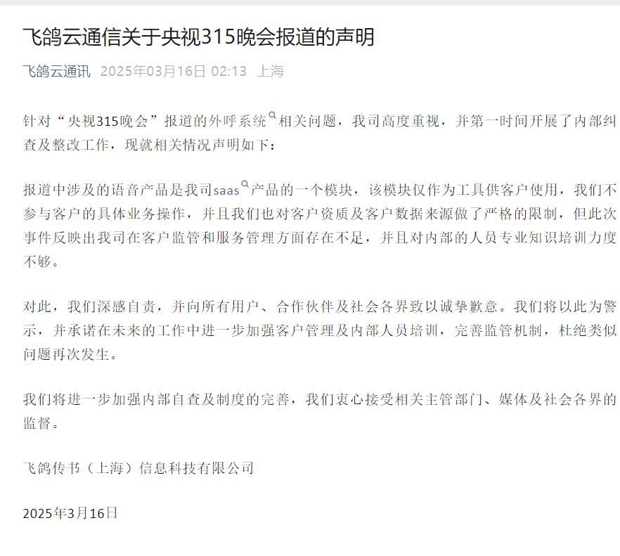 【大河财立方消息】针对“央视315晚会”报道的外呼系统相关问题,3月16日,飞鸽云通信发布声明称,高度重视,并第一时间开展了内部纠查及整改工作。