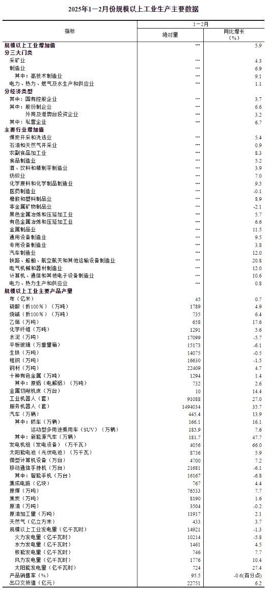 1—2月份,规模以上工业企业产品销售率为95.5%,同比下降0.6个百分点;规模以上工业企业实现出口交货值22751亿元,同比名义增长6.2%。