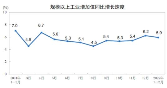 中新网3月17日电 据国家统计局网站消息,1—2月份,规模以上工业增加值同比实际增长5.9%(增加值增速均为扣除价格因素的实际增长率)。从环比看,2月份,规模以上工业增加值比上月增长0.51%。