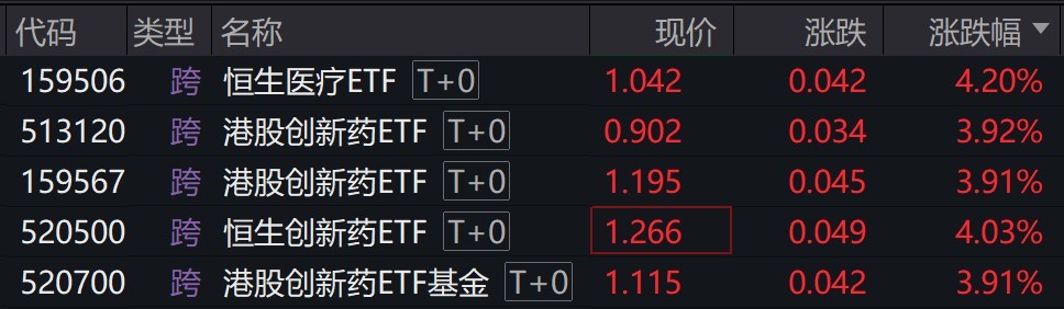 受重仓股上涨影响,恒生医疗、港股创新药相关ETF涨约4%。