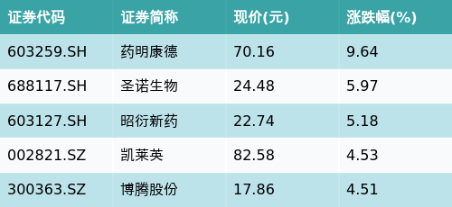 截至早盘收盘,CRO/CMO主题涨跌幅最高的五只股票为:药明康德(603259.SH)、圣诺生物(688117.SH)、昭衍新药(603127.SH)、凯莱英(002821.SZ)与博腾股份(300363.SZ)。详情见下表: